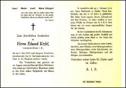 ∞ am 05.02.1910 mit Anna Fischenich in Kalkar Krs. Euskirchen; 45 glückliche Ehejahre; 3 Kinder; 36 Jahre im Dienste der KFBE; Lokomotivführer i.R.; |