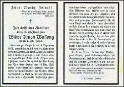 ∞ am 14.11.1896 mit Anton Wassong 10.12.1902 †; 4 Kinder, davon 1 †; |