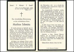 Eltern Walter Schmitz und Appolonia Franken; ∞ am 20.11.1920 in Bottenbroich mit Cäcilia Lintermann; 2 Kinder, davon Sohn Hermann seit Januar 1944 in Rußland vermißt; |