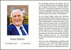 Eltern Franz u. Elisabeth Ebbeler geb. Tomberge; 7 Geschwister; ∞ am 05.06.1952 mit Franziska Abels ( 08.12.2002 † ) vom Busleihof in Königshoven; zugen auf den Christianshof nach Blessem; 2 Kinder; |