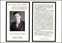 Ist infolge einer Verwundung aus den Kämpfen bei Frankfurt/Oder gestorben.Eltern Johann Stahl und Maria Kiefernagel aus Frechen-Hücheln, 1 Bruder, 2 Schwestern. |