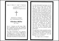 Heimatvertriebene; neue Heimat in Holzheim; ∞ 21.8.1954 Willi Müller; 1 Tochter, *1957; 1 Sohn *25.3.1960; sie starb an den Folgen der Geburt |