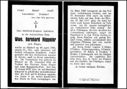 Eltern: Heinr. Finger u. Anna Margar. Floh; ∞ 10.1.1876 Bernhard Hüppeler, † 13.5.1917; 10 K., davon 3 früh †; verh. Tochter † 14.3.1909; verh. Sohn fiel am 27.11.1916 im 1. Weltkrieg; verh. Sohn verunglückte † |