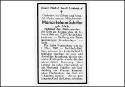 Mitgl. d. Müttervereins; ∞ 1922 Hermann Schiffer aus Geddenberg; 5 K.; seit der Geburt des jüngsten Kindes 10. J. lang in vollständiger Lähmung ans Bett gefesselt |