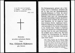 ∞ 28.5.1902 Uhrmachermeister Heinrich Bückmann in Wesel; Zerstörung des Heimes 1945; deshalb letzte Lebensjahre in der Famlie der Tochter in Bedburg/Erft; Grab: Friedhof in Wesel, neben ihrem Gatten |
