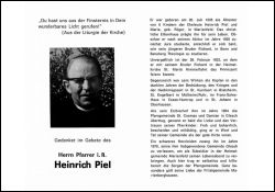 Eltern: Heinrich Piel u. Maria geb. Röger; Primiz mit seinem Bruder Richard am 28.2.1933; Kaplan in Blatzheim, Mülheim/Ruhr, Essen-Huntrop, Oberhausen; 1954 Pfarrer in Glesch; 1970 Subsidiar Marienfeld |