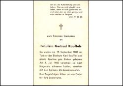 Fräulein; Eltern: Karl Kauffels u. Maria Josefine geb. Stirken; längeres, schweres Leiden |