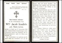 ∞ 29.1.1874 Jacob Kauffels, † ; 8 K., davon 7 †; |