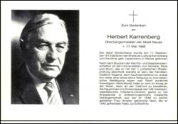 Oberbürgermeister der Stadt Neuss; Eltern: Ludwig Karrenberg u. Karolina geb. Lepelmann; Studium der Rechts- u. Staatswissenschaft; ∞ 1942 Amelie Geyr; 1948 Rückkehr aus russischer Kriegsgefangenschaft; 3 Töchter; seit 1964 Bürgermeister, seit 1967 Oberbürgermeister von Neuss |