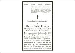 Opfer 2. Weltkrieg; Tod bei Bombenangriff auf Maschinenfabrik Buckau in Magdeburg; Eltern: Heinrich Frings u. Maria geb. Sels; Dipl.Ing.; Oberingenieur bei Buckau R. Wolf A.G. Magdeburg; ∞ 6.9.1939 Milli Peerenb∞m; 4 K. |