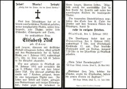 ∞ 9.10.1913 Lehrer Peter Nick; 7 K.; langes, schweres Leiden |