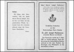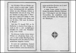 Priesterweihe 28.3.1916; Lehrer an Höherer Schule in Neunkirchen; 23.8.1916 Kaplan in Elberfeld, 9.4.1919 in Haan, 22.3.1928 St. Marien in Rheydt, seit 19.8.1929 in Aachen-Forst; zuletzt zum Pfarrer von Mündt ernannt; schweres Leiden |