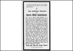 Eltern: Hubert Kaufmann und Maria Magdalena geb. Schmitz; Lungenentzündung; Neffe Hubert Emmerich vor 8 T. †; (Druck in Köln-Nippes) |