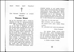 Eltern: Vinzenz Waser u. Gertrud geb. Junkers; ∞ 15.7.1911 Adele Meyer aus Emmerich; 1 Sohn; 48 J. als Fräser b. Fa. Schiess in Düsseldorf tätig; im Alter schwere körperl. Gebrechen |
