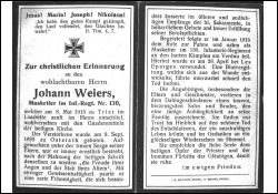 Gefallener 1. Weltkrieg; Einberufung Januar 1915; am 26.4.1915 bei Les Eparges (Kämpfe um Verdun) verwundet; |