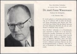 Facharzt für Orthopädie; Eltern: Konrektor Anton Watermann u. Therese geb. Führing, †; 2. Ehefrau Margarete Meerfeld; Kindheit in Friedrichstadt, Jugend in Neuss; 1924 Facharzt f. O. in Osnabrück; ∞ 1926 Clara Brink; 5 K.; im 2. Weltkrieg verwundet; baute Privatklinik in Osnabrück auf |