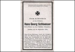 Gefallener 2. Weltkrieg; Eltern: Hans A. Schloesser u. Marga geb. Anderheiden; nach monatelangen Kämpfen im Osten Gelbfieber; in mehreren Lazaretten, zuletzt in Oberschlesien; Genesungsurlaub zu Hause; Einsatz im Westen; Friedhof Lohn, Kr. Jülich |