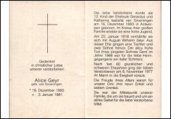 Eltern: Gerardus u. Katharina Isabella van Groeningen; ∞ 22.1.1918 August Wilhelm Geyr, † 6.11.1977; 3 K., davon jüngster Sohn Gerd † 1968; |