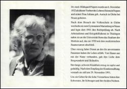 Eltern: Lehrer Heinrich Piepers u. Juliana geb. Aurisch; Abitur 1941 Gymn. Marienberg in Neuss; 1950 med. Staatsexamen; über 40 J. Dienst an Patienten; lange, schwere Krankheit |