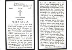 Eltern: Peter Keull und Katharina geb. Peters; übernahm elterl. Betrieb; ∞ 3.6.1902 Anna Overrath; 3 K.; Mitgl. Kirchenvorstand; in Vorständen kirchl. Vereine; manche Ehrenämter; langes, schweres Leiden |
