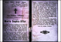 Fräulein; Lehrerin a.D.; Eltern: Peter Offer u. Barbara geb. Krücken; Ausbildung in Düsseldorf; tätig in Hochneukirch, Nievenheim, seit 1875 Hauptlehrerin in Osterath; 1.10.1910 Ruhestand; Rückkehr ins elterliche Haus zu Geschwistern |
