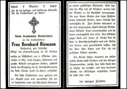 ∞ 19.9.1883 Bernhard Riemann; 11 K., davon 3 †; Mitgl. Frauenkongregation St. Rochus |