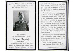 Gefallener 2. Weltkrieg; Unteroffizier auf untergegangenem Dampfer "Wigbert"; Eltern: Mathias Ropertz u. Cäcilia geb. Weitz; |