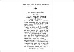 ∞ 1.2.1910 Anton Ditzer, † April 1958; 4 K.; 1 Sohn im 2. Weltkrieg in Rußland vermißt |