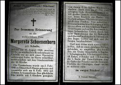 ∞ 8.2.1872 Johann Schoenenborn, † 21.10.1901; 9 K., davon 3 früh †; Druck in Osterath |