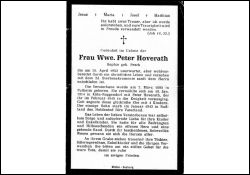 ∞ 10.1.1914 in Köln-Roggendorf Peter Hoverath, † Febr. 1945; 4 K.; der einzige Sohn 1942 im 2. Weltkrieg in Rußland gefallen (gedruckt in Bedburg) |