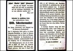 Brandmeister der Freiw. Feuerwhr; erlitt am 11.9.1953 in seiner Schmiedewerkstatt tödliche Verbrennungen; Mitgl. St. Johannesbruderschaft; Eltern: Johann Schreinemacher u. Berta geb. Rögels; ∞ 11.4.1942 Katharina Paulussen aus Gerderath; 3 K. |