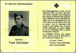Gefallener 2. Weltkrieg; Eltern: Anton Schröder u. Margarete geb. Hösen; am 21.9.1944 zum 2. Mal schwer verwundet |