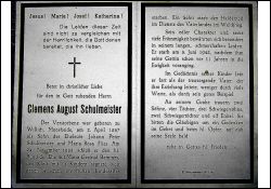 Eltern: Johann Peter Schulmeister u. Maria Rosa geb. Flies; ∞ 24.11.1883 Maria Gertrud Bommes, † vor 11 J. † ; 11 K., davon 4 früh †, 1 Sohn im 1. Weltkrieg gefallen; Druck in Willich |