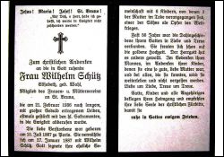 Mitgl. Mütterverein St. Bruno; ∞ 27.1.1887 Wilhelm Schütz; 6 K., davon 3 †, 1 Sohn im 1. Weltkrieg gefallen; |