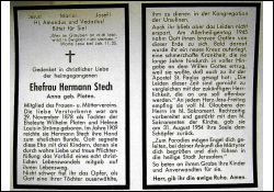 Eltern: Wilhelm Platen u. Helene Louis; ∞ 1909 Hermann Stech, † 1.11.1945; 3 K.; 1 Tochter trat in Kongregation der Ursulinen ein; lange Jahre schmerzhafte Krankheit |