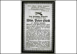 Mitgl. Mütterverein in Lank; längeres Leiden; ∞ Peter Steck, † 1882; 1 Sohn, der zu den Waffen gerufen ist |