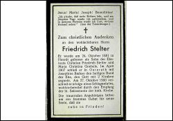 Schlaganfall; Eltern: Christian Friedrich Stelter u. Maria Christina Goebels; ∞ April 1907 in Osterath Josephine Backes; 2 K. |