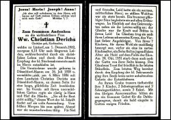 ∞ 6.3.1886 Landwirt Christian Derichs aus Düsseldorf-Hamm, † 24.10.1931; 7 K., davon 1 früh †, 1 Sohn im 1. Weltkrieg gefallen |