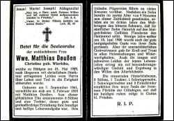 Längeres Leiden; ∞ 2.2.1888 Matthias Deußen, † 15.6.1920; 6 K.; 1 Sohn früh †; Sohn Heinrich im 1. Weltkrieg in Flandern gefallen; |