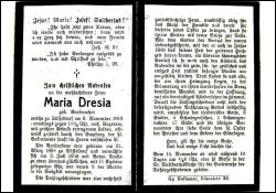 Längeres Leiden; ∞ 2.7.1859 Anto Dresia; 11 K., davon 5 †; 1909 Goldhochzeit; |