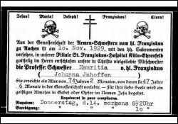 19.3.1882 Eintreitt in Genossenschaft der Armen Schwestern vom hl. Franziskus in Aachen; wirkte seit 16.1.1895 im Franziskushospital in Köln-Ehrenfeld; Sakristanin; lange, schmerzhafte Krankheit |