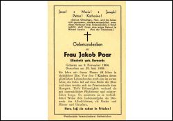 45 J. verh. mit Jakob Paar; 7 K., davon 1 früh †; 1 Sohn im 1. Weltkrieg gefallen; 1 Sohn Priester; Druck in Geilenkirchen |