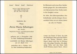 ∞ 29.4.1913 Reiner Schwingen; Mitgl. Frauen- u. Müttergemeinschaft; Ehemann †; 2 K., davon 1 †; |