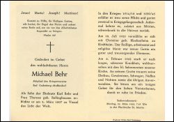 Mitgl. Kriegerverein Muffendorf; Eltern: Karl Behr u. Therese geb. Bellinghausen; Soldat im 1. u. 2. Weltkrieg; zweimal Kriegsgefangenschaft; kehrte schwerkrank aus Sibirien zurück; ∞ 18.7.1926 Christine Blankenheim zu Kirchheim; lange schwere Krankheit; Wohnort: Bad Godesberg-Muffendorf |