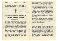 Oberwerkmeister i. R.; Eltern: Johann Müller u. Therese geb. Hahn, † 3.9.1918; ∞ 18.5.1906 Maria Moskopp; 2 Söhne, davon Sohn Robert im 2. Weltkrieg gefallen; ∞ 30.4.1920 Katharina Bellinghausen, † 19.8.1936; tätig bei Wasserwerk Sindorf; viele Jahre Mitgl. Kirchenvorstand; die letzten Jahre getrübt durch Krankheit |