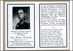 Gefallener 2. Weltkrieg; Eltern: Karl Drenk u. Anna geb. Helten; verlobt; Pg., begeisterte Pflichterfüllung für Führer, Vaterland u. Deutschlands Zukunft |