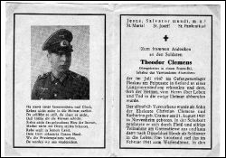 Gefallener 2. Weltkrieg; Eltern: Christian Clemens u. Katharina geb. Cramer; Schlosserlehre in Düsseldorf-Herdt; Einberufung Febr. 1941 (Rückseite fehlt) |