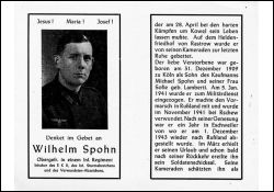 Gefallener 2. Weltkrieg; Eltern: Michael Spohn, Kaufmann, u. Sofie geb. Lamberti; 5.1.1941 eingezogen; Nov. 1941 verwundet; Genesung; 1.12.1943 wieder nach Rußland; verheiratet; 3 Söhne |