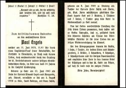 Tod durch Unglücksfall auf der Arbeitsstätte; Eltern: Winand Engels u. Margareta geb. Schnock; ∞ 2.8.1930 in Köln Anna Schütz, geb. 8.6.1909 in Straberg als Tochter von Peter Schütz u. Maria geb. May; 3 K., davon 1 früh † |