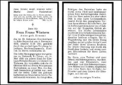 Eltern: Wilhelm Erasmi u. Josephine geb. Thönnes; ∞ 19.10.1929 Franz Wintzen aus Nievenheim; Sohn Peter mit 17. J. auf der Zugspitze tödlich verunglückt; jahrelanges schleichendes Leiden; 3 überlebende Kinder |